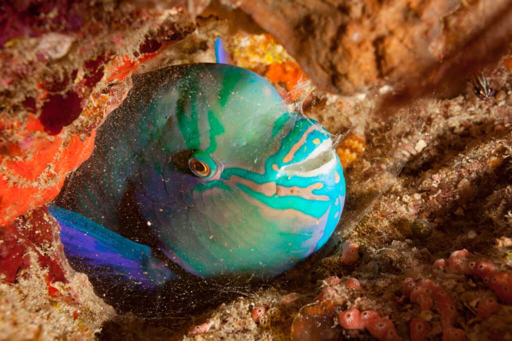 Some fish have even been observed wedging themselves into small crevices or under mud to catch some shut-eye; in particular, blue tangs will sleep in rocks all wedged in together, which are sometimes called dory hotels! Parrotfish create a mucus cocoon or bubble when they sleep, in order to protect themselves from parasites and to mask its own scent from predators.