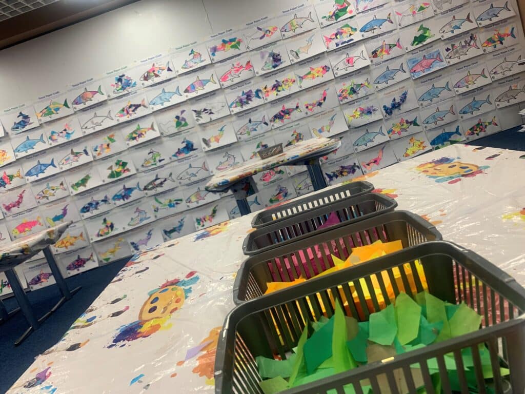 Visitors to Blue Planet Aquarium were ecstatic to see a whole room dedicated to crafts! look at our Tissue Paper art wall below: